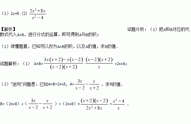 (1)2x+8;(2) 【解析】试题分析:(1)把A和B对应的代数式代入A×B,进行分式的运算,即可得到A与B的积; (2)读懂题意,已知可以改为A×B的积,以及A的值,求B的值. 试题解析:(1) A×B==2x+8; (2)“逆向”问题是:已知A×B=2x+8,A=,求B的值. B=(2x+8)÷()=(2x+8)×=. 考点:分式的混合运算.按要求完成下列各题: