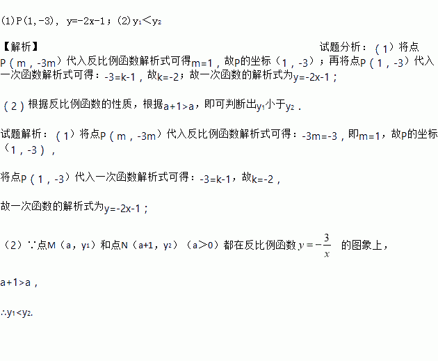 (2)若点M(a,y1)和点N(a+1,y2)(a>0)都在反比例函数的图象上,试通过计算或利用反比例的性质,说明y1与y2的大小.