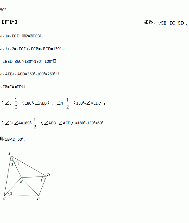 查看答案已知四边形ABCD内有一点E,满足EA=EB=EC=ED,且∠BCD=130°,那么∠BAD的度数为_____.