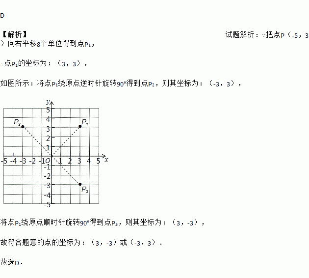 在平面直角坐标系中,把点P(﹣5,3)向右平移8个单位得到点P1,再将点P1绕原点旋转90°得到点P2,则点P2的坐标是( )