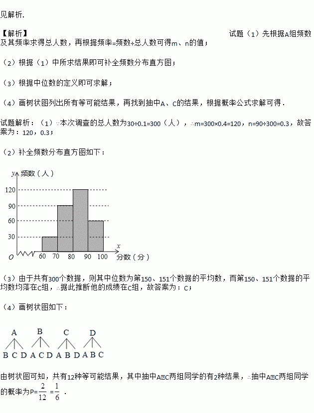 (3)小明的成绩是所有被抽查学生成绩的中位数,据此推断他的成绩在 组;
