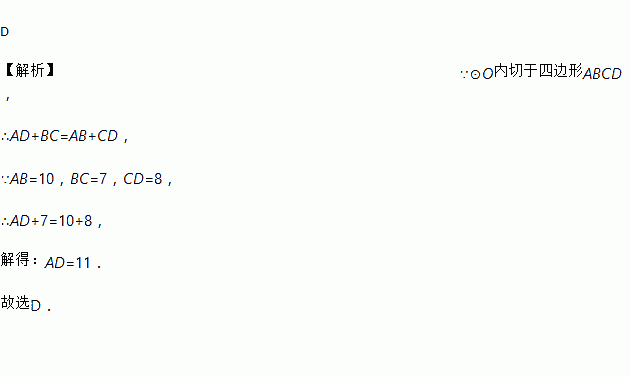 如图,⊙O内切于四边形ABCD,AB=10,BC=7,CD=8,则AD的长度为( )