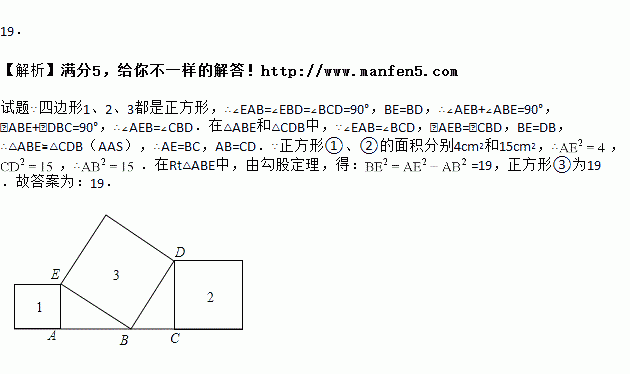 已知正方形①、②在直线上,正方形③如图放置,若正方形①、②的面积分别4cm2和15cm2,则正方形③的面积为 .