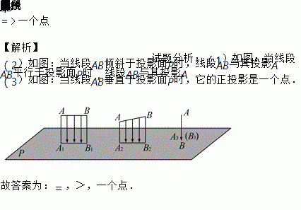 如图:(1)当线段AB平行于投影面P时,它的正投影是线段A1B1,线段与它的投影的大小关系为AB