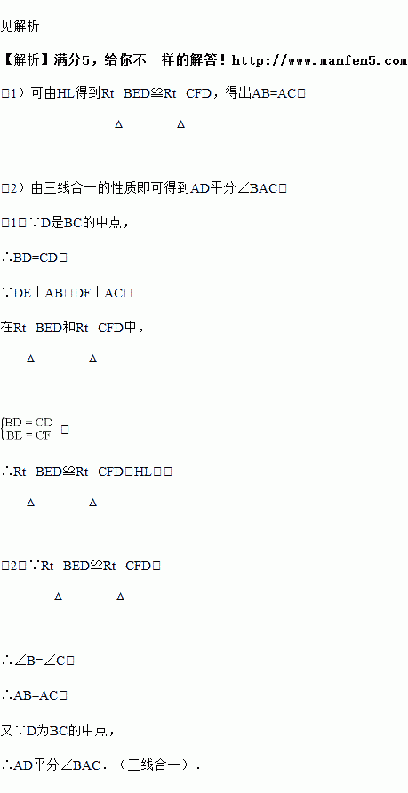 如图,在△ABC中,D是BC的中点,DE⊥AB于E,DF⊥AC于点F,且BE=CF.