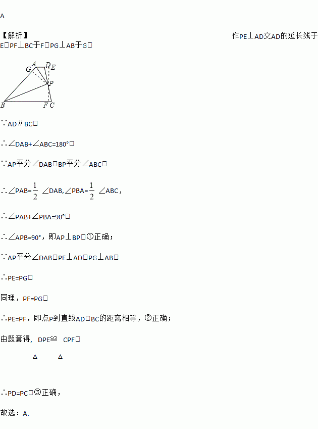 如图,已知四边形ABCD中,AD∥BC,AP平分∠DAB,BP平分∠ABC,它们的交点P在线段CD上,下面的结论:①AP⊥BP;②点P到直线AD,BC的距离相等;③PD=PC.其中正确的结论有( )
