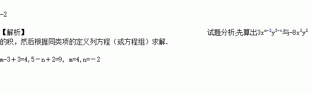 已知3xm-3y5-n与-8x3y2的积是2x4y9的同类项,求m、n的值.