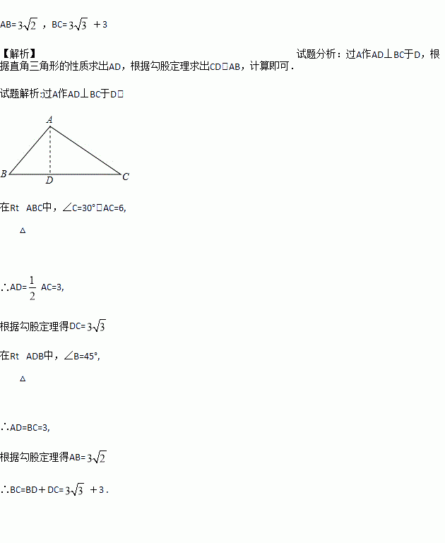 如图,在△ABC中, ,AC=6,求AB、BC的长。