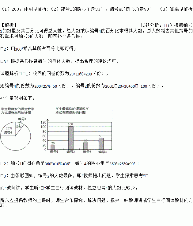 (1)200,补图见解析;(2)编号1的圆心角是36°,编号4的圆心角是90°;(3)答案见解析. 【解析】试题分析:(1)根据编号1的数量及其百分比可得总人数,总人数乘以编号4的百分比求得其人数,总人数减去其他编号的数量求得编号2的人数,即可补全条形图; (2)用360°乘以其所占百分比即可得; (3)根据条形图各编号的具体人数,提出合理的建议均可. 试题解析:(1)收回...