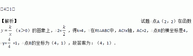 如图,Rt△ABC的两个锐角顶点A,B在函数y=(x>0)的图象上,AC∥x轴,AC=2,若点A的坐标为(2,2),则点B的坐标为_______.