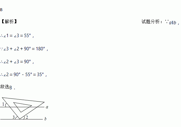 如图,小明课间把老师的三角板的直角顶点放在黑板的两条平行线、上,已知∠1=55°,则∠2的度数为( )