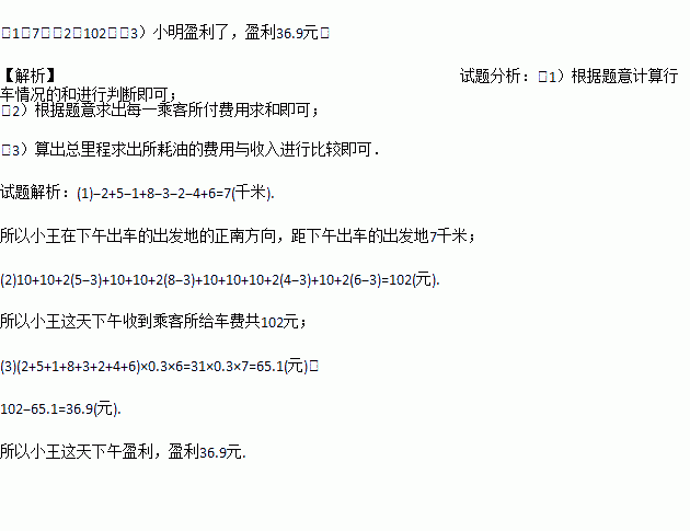 (3)若小明的出租车每千米耗油0.3升,每升汽油7元,不计汽车的损耗,那么小明这天下午是盈利还是亏损了?盈利(或亏损)多少钱?