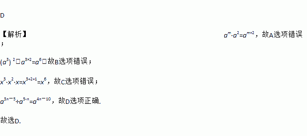 A. am·a2=a2m B. (a3) 2=a3 C. x3·x2·x= x5 D. a3n-5÷a5-n=a4n-10