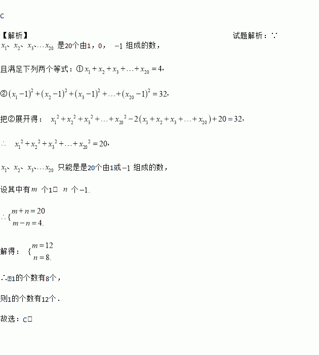 x1、x2、x3、…x20是20个由1,0,﹣1组成的数,且满足下列两个等式:①x1+x2+x3+…+x20=4,②(x1﹣1)2+(x2﹣1)2+(x3﹣1)2+…+(x20﹣1)2=32,则这列数中1的个数为( )