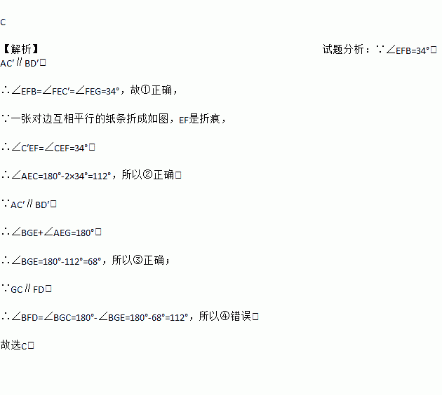 如图,把一张对边互相平行的纸条折成如图,EF是折痕,若∠EFB=34°则下列结论正确的有( )