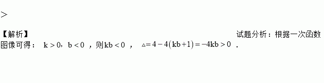 如图是一次函数y=kx+b的图象的大致位置,试判断关于x的一元二次方程x2﹣2x+kb+1=0的根的判别式△________ 0(填:“>”或“=”或“<”).