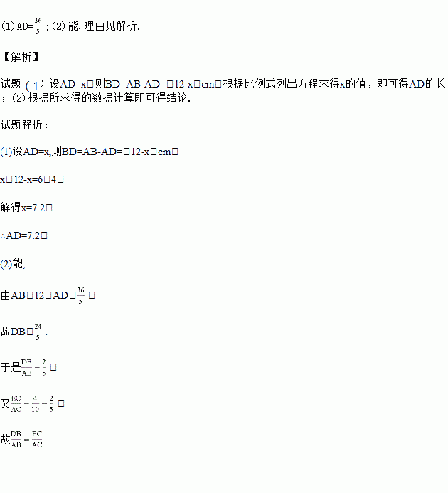 在△ABC中,AB=12,点E在AC上,点D在AB上,若AE=6,EC=4,。