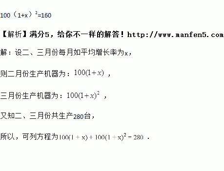 某厂一月份生产某机器 100 台,计划三月份生产 160 台.设二、三月份每月的平均增长率为 x,根据题意列出的方程是____________.