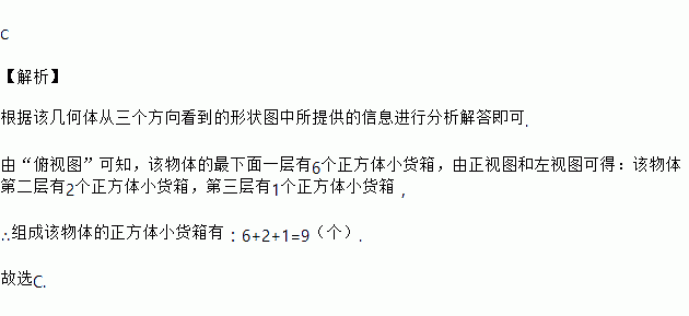 在一仓库里堆放着若干个大小相同的正方体小货箱,仓库管理员将从三个方向看到的物体的形状图画了出来,如图所示,则这堆正方体小货箱共有( )