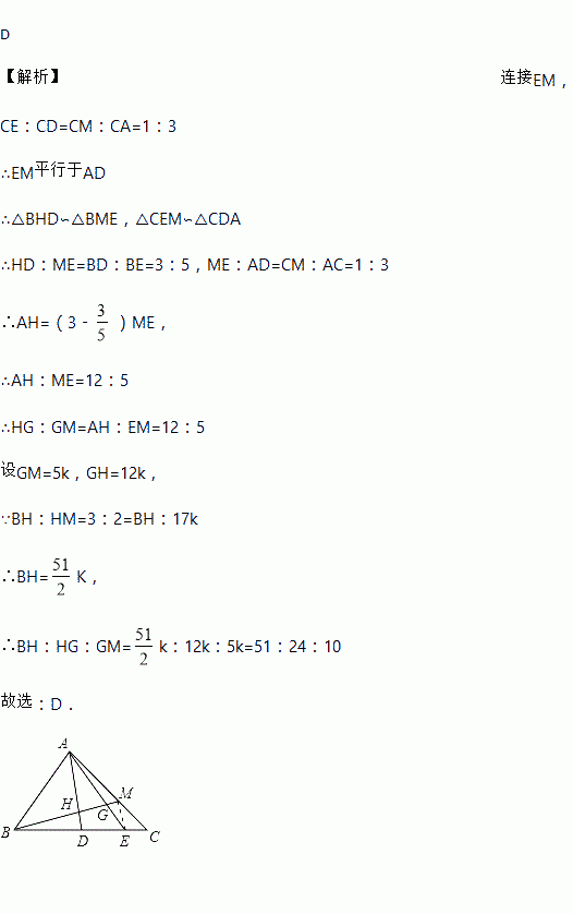 如图,△ABC中,D、E是BC边上的点,BD:DE:EC=3:2:1,M在AC边上,CM:MA=1:2,BM交AD,AE于H,G,则BH:HG:GM等于( )