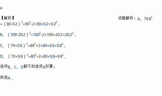 A 【解析】试题解析:A、79.82=(80-0.2)2=902-2×90×0.2+0.22, B、(100-20.2)2=1002-2×100×20.2+20.22, C、(79+0.8)2=892+2×89×0.8+0.82, D、(70+9.8)2=802+2×80×9.8+9.82, 选项B、C、D都不如选项A好算, 故选A.