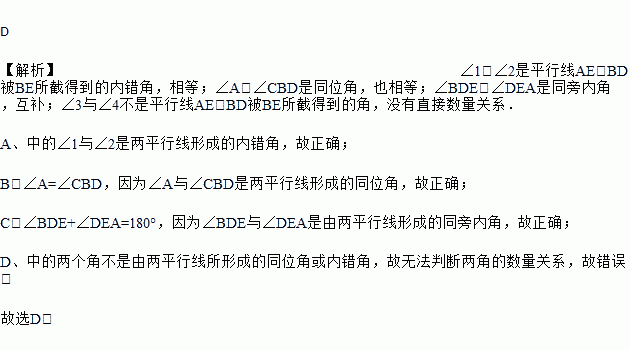 如图所示,AE∥BD,下列说法不正确的是 ( )