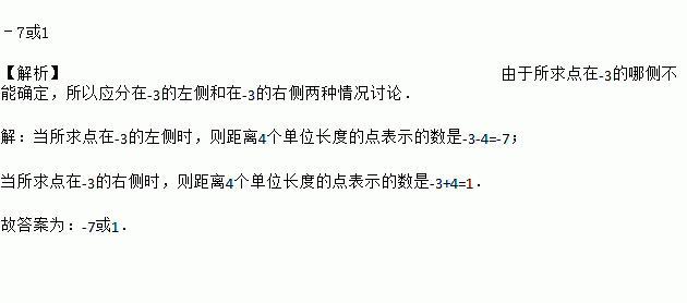 ﹣7或1 【解析】由于所求点在-3的哪侧不能确定,所以应分在-3的左侧和在-3的右侧两种情况讨论. 【解析】 当所求点在-3的左侧时,则距离4个单位长度的点表示的数是-3-4=-7; 当所求点在-3的右侧时,则距离4个单位长度的点表示的数是-3+4=1. 故答案为:-7或1.