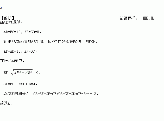 如图,折叠矩形纸片ABCD的一边AD,使点D落在BC边上的点F处,若AB=8,BC=10,则△CEF的周长为( )