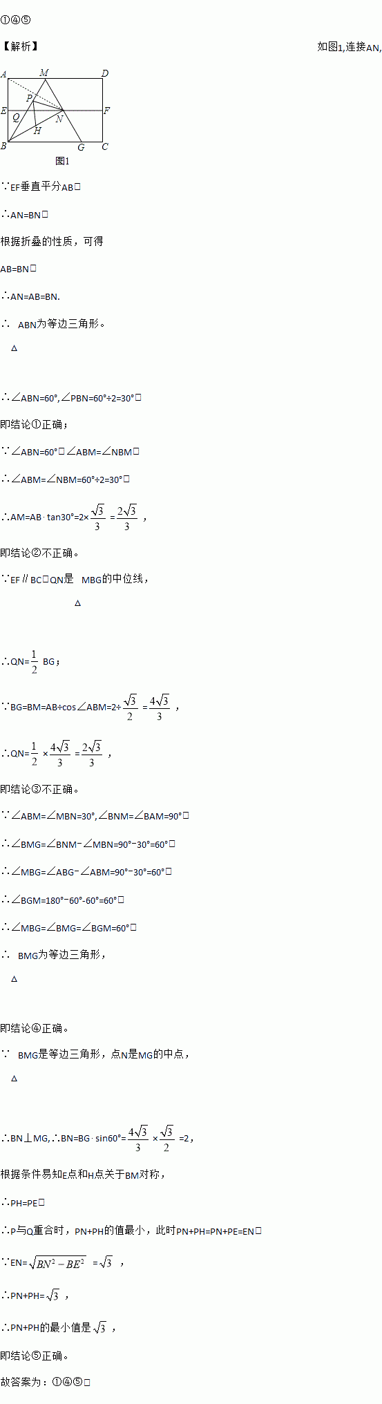 如图,四边形ABCD是矩形纸片,AB=2.对折矩形纸片ABCD,使AD与BC重合,折痕为EF;展平后再过点B折叠矩形纸片,使点A落在EF上的点N,折痕BM与EF相交于点Q;再次展平,连接BN,MN,延长MN交BC于点G.有如下结论: