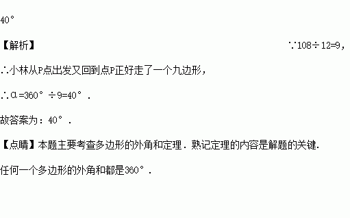 小林从P点向西直走12米后,向左转,转动的角度为α,再走12米,如此反复,小林共走了108米回到点P,则角α的度数为____.