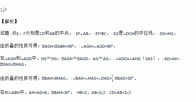 如图,在一张矩形纸片ABCD中,AD=4cm,点E,F分别是CD和AB的中点,现将这张纸片折叠,使点B落在EF上的点G处,折痕为AH,若HG延长线恰好经过点D,则CD的长为_________.