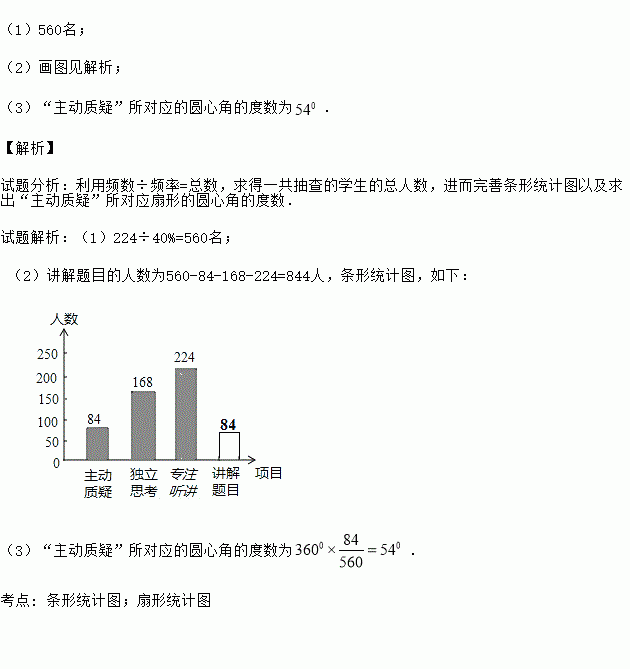 (1)560名; (2)画图见解析; (3)“主动质疑”所对应的圆心角的度数为. 【解析】 试题分析:利用频数÷频率=总数,求得一共抽查的学生的总人数,进而完善条形统计图以及求出“主动质疑”所对应扇形的圆心角的度数. 试题解析:(1)224÷40%=560名; (2)讲解题目的人数为560-84-168-224=844人,条形统计图,如下: (3)“主动质...