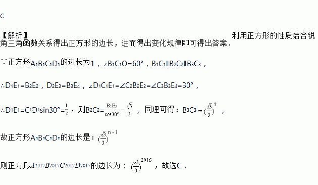 一组正方形按如图所示的方式放置,其中顶点B1在y轴上,顶点C1、E1、E2、C2、E3、E4、C3…在x轴上,已知正方形A1B1C1D1的边长为1,∠B1C1O=60°,B1C1∥B2C2∥B3C3…则正方形A2017B2017C2017D2017的边长是( )