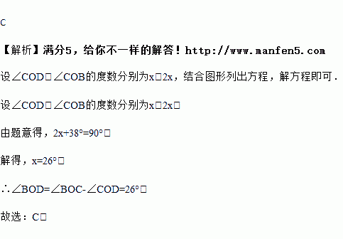 如图,若∠AOB是直角,∠AOC=38°,∠COD:∠COB=1:2,则∠BOD等于( )