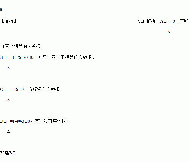 B 【解析】试题解析:A、△=0,方程有两个相等的实数根; B、△=4+76=80>0,方程有两个不相等的实数根; C、△=-16<0,方程没有实数根; D、△=1-4=-3<0,方程没有实数根. 故选B.