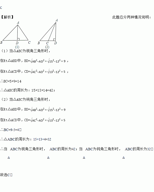 在△ABC中,AB=15,AC=13,高AD=12,则△ABC的周长为( )