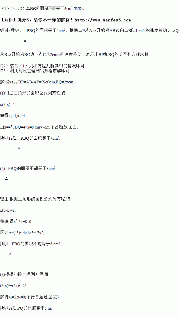 如图,在△ABC中,∠B=90°,AB=5cm,BC=7cm.点P从点A开始沿AB边向点B以1cm/s的速度移动,点Q从点B开始沿BC边向点C以2cm/s的速度移动.