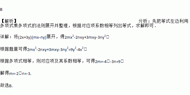 若(2x+3y)(mx-ny)=9y2-4x2,则m、n的值为 ( )