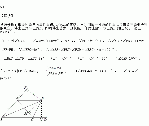 如图,△ABC的外角∠ACD的平分线CP与内角∠ABC平分线BP交于点P,若∠BPC=40°,则∠CAP= .