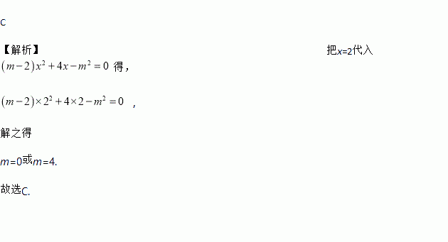 已知x=2是一元二次方程的一个根,则m的值为 ( )