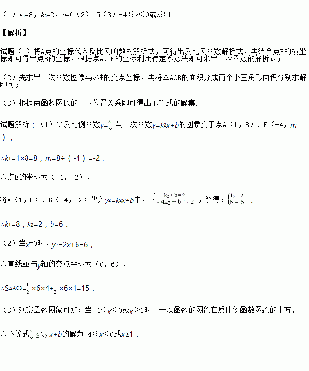 如图,已知反比例函数y1=与一次函数y2=k2x+b的图象交于点A(1,8),B(﹣4,m)两点.