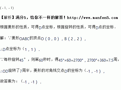 如图,已知菱形的顶点,,若菱形绕点逆时针旋转,每秒旋转,则第秒时,菱形的对角线交点的坐标为________.
