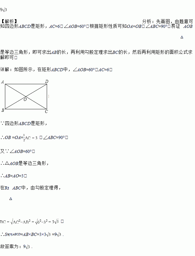 已知矩形的两条对角线的夹角为60°,如果一条对角线长为6,那么矩形的面积为___________.