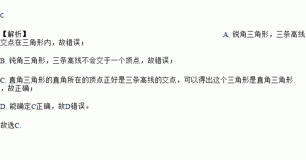 C 【解析】A. 锐角三角形,三条高线交点在三角形内,故错误; B. 钝角三角形,三条高线不会交于一个顶点,故错误; C. 直角三角形的直角所在的顶点正好是三条高线的交点,可以得出这个三角形是直角三角形,故正确; D. 能确定C正确,故D错误。 故选C.