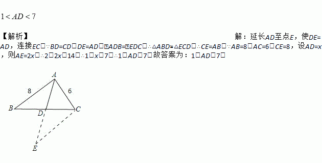【解析】【解析】 延长AD至点E,使DE=AD,连接EC,∵BD=CD,DE=AD,∠ADB=∠EDC,∴△ABD≌△ECD,∴CE=AB,∵AB=8,AC=6,CE=8,设AD=x,则AE=2x,∴2<2x<14,∴1<x<7,∴1<AD<7.故答案为:1<AD<7.