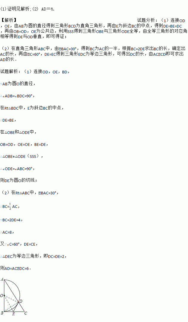 (1)证明见解析;(2) AD=6. 【解析】试题分析:(1)连接OD,OE,由AB为圆的直径得到三角形BCD为直角三角形,再由E为斜边BC的中点,得到DE=BE=DC,再由OB=OD,OE为公共边,利用SSS得到三角形OBE与三角形ODE全等,由全等三角形的对应角相等得到DE与OD垂直,即可得证; (2)在直角三角形ABC中,由∠BAC=30°,得到BC为AC的一半,根据BC=2DE...