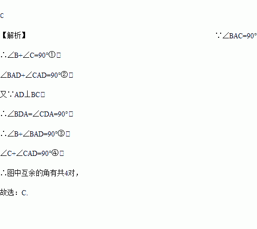 如图,∠BAC=90°,AD⊥BC,则图中互余的角有( )