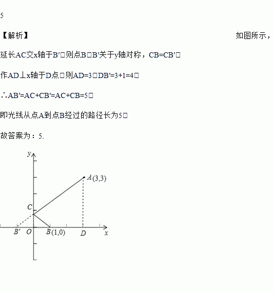 如图,一束光线从点A(3,3)出发,经过y轴上点C反射后经过点B(1,0),则光线从点A到点B经过的路径长为_____.