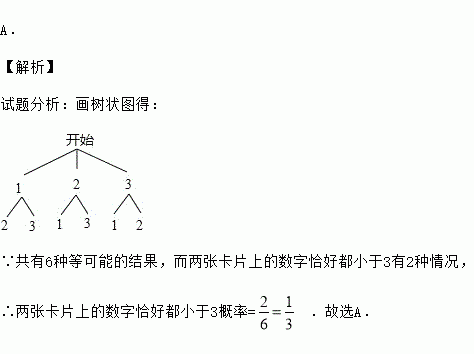 三张外观相同的卡片分别标有数字1、2、3,从中随机一次抽出两张,这两张卡片上的数字恰好都小于3的概率是( )