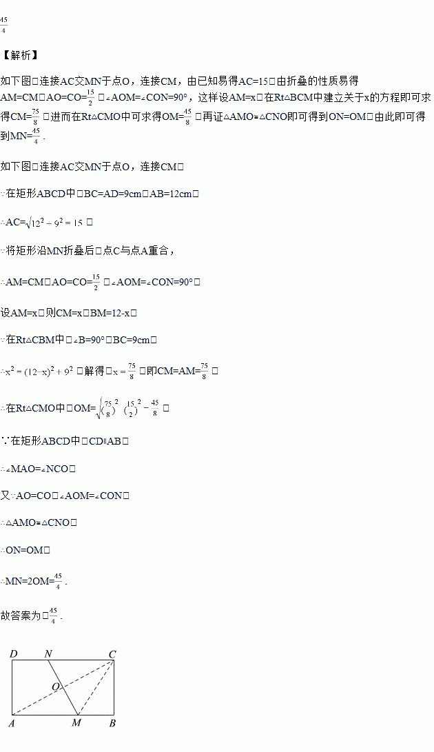 如图,一张矩形纸片ABCD,AD=9 cm,AB=12 cm,将纸片折叠使A,C两点重合,那么折痕MN=________cm.